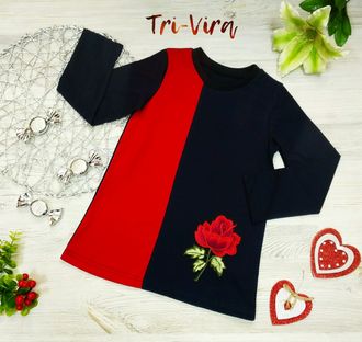Платье с длинным рукавом, из хлопкового трикотажа не только стильное, но необычайно комфортное. Модель с округлой горловиной, нижняя часть платья декорировано пришивной аппликацией " Роза "