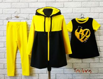 Арт. КБК/Т/2 Комплект: кардиган(футер)+туника+лосины(кулир).Цв.черн/желт(желт.молн).Размер с 86-140