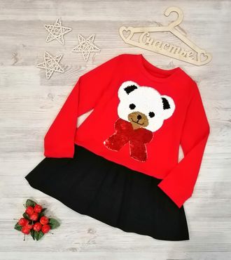 Полочка платья декорирована пришивным принтом с пайетками «Медведь с бантом»