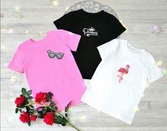В наличии: Белая футболка ( возможна земена аппликации на фламинго с пайетками )