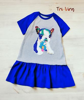 Платье из хлопкового трикотажа не только стильное, но необычайно комфортное. Модель с округлой горловиной, нижняя часть платья декорировано пришивной аппликацией с пайетками.
