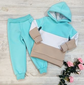 Арт.18/НАЧЕС/ТРЕХЦВ/2 Теплый комплект из футера с начесом. Цвет: тиффан/бел/беж. Размер с 98-128