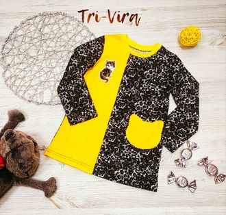 Платье с длинным рукавом, из хлопкового трикотажа не только стильное, но необычайно комфортное. Модель с округлой горловиной, платье декорировано пришивной аппликацией " Кошка "
