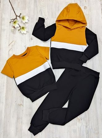Арт. 3/Ф/ХФБ-1 Костюм тройка: худи+брюки+футболка(футер).Цвет: черн/горчица/белый. Размер с 86-152