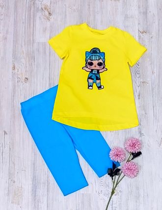 Арт. 2КУЛ/АПЛ/ТБ-КУКЛА-1 Комплект туника+бриджи (кулир).Цвет:желтый/бирюзовй. Размер с 86-134