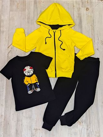 Арт. 3/ПРЕМ/МЕДВЕДЬ Премиум коллекция: толстовка+штаны(футер)+футболка(кулир). Цвет:желт/черный.Размер с 86-152